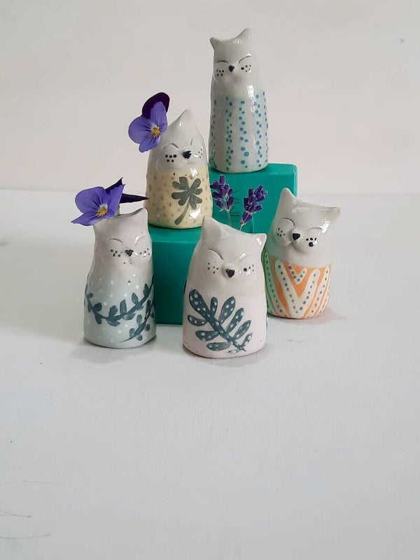 This tiny vase will add some fun to your home. A little hole at the top allows you to insert 1-2 small leaves or flowers. The vase is sculpted by hand, handpainted and dipped in transparant glaze. Size between 4 and 5cm.