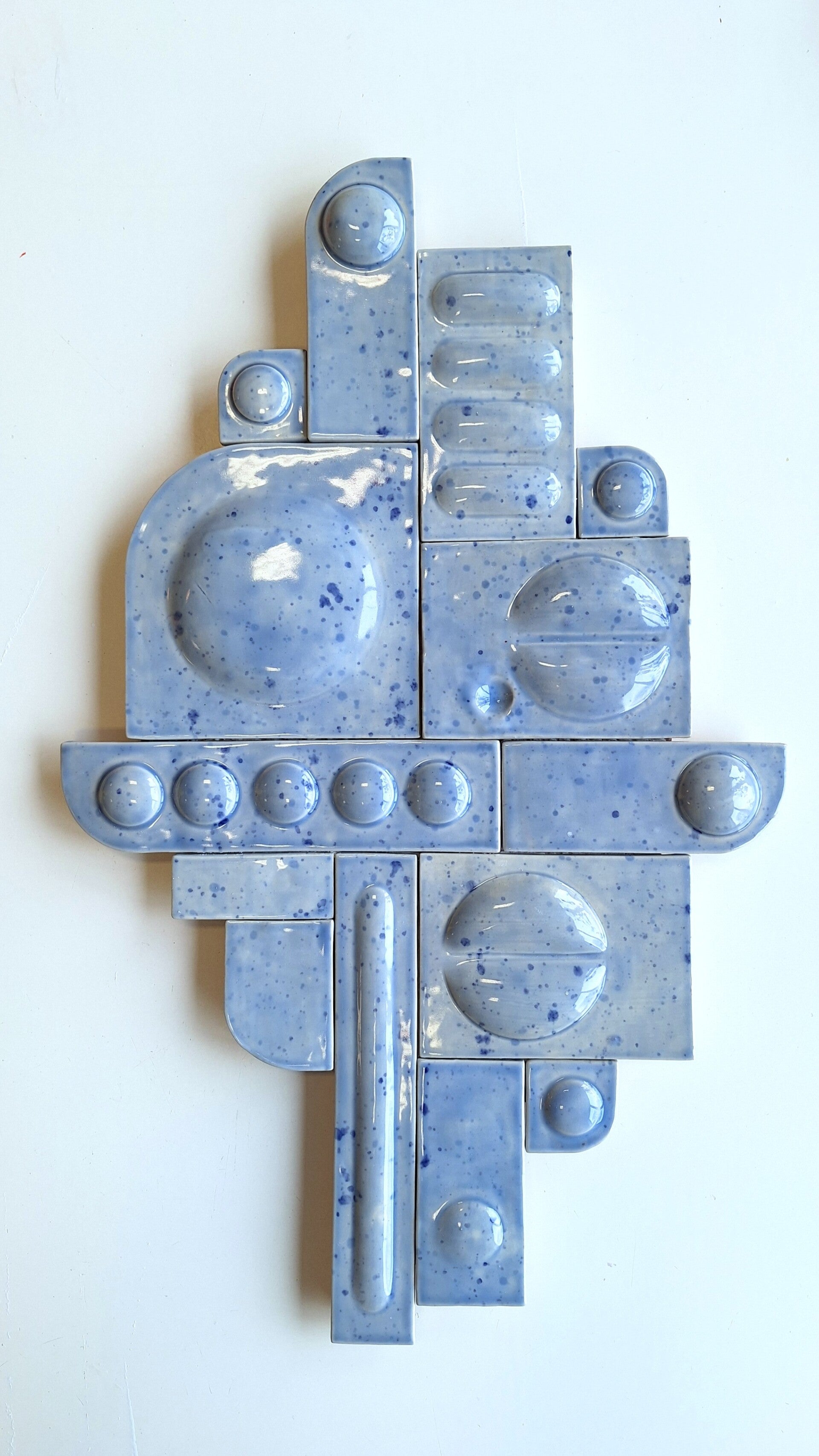 Dit tegeltableau is een krachtig maar verstild object. Opgebouwd uit keramische tegels in lichtblauw met donkerblauwe spetters ontstaat een ritme van kleur, lijn en textuur. Het glazuur reageert subtiel op licht en omgeving, waardoor het werk blijft veranderen.